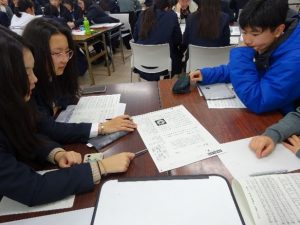 12月7日(木)、中国の南京田家炳高級中学(日本の高等学校に相当します。)から、修学旅行生41名と引率の先生が来校され、本校の2年生と2時間あまり、交流会を行いました。