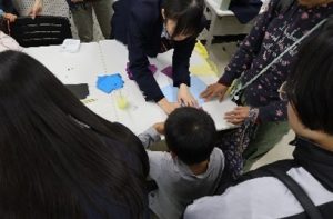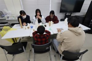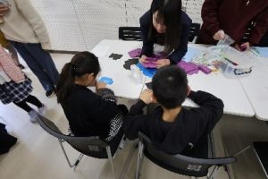11月16日(日)に、滋賀大学大津キャンパスにて、科学の祭典滋賀大会が開催されました。その大会に本校からは5つの工作ブース(ダンシングスネイク・ストロー笛・虹の箱つくり・色ペンアート・セロテープアート)を出展し、中学生41名が指導者として活躍しました。寄り添って教える姿や、来場者を巻き込んで音作りの実験をする姿など、懸命に教える姿は来場者から大好評でした。主催者からも、「こんなにもたくさんの中学生が主体的に教えている姿がとても素敵だと思った。」という感想をいただきました。工作教室を通して、科学のおもしろさを伝え、自分たち自身も科学のおもしろさを実感しました。