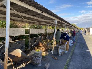 当日は70名を超える保護者の皆さまがボランティアとして集まってくださいました。自転車置き場周辺を中心に草刈りを行い、短い時間の中でたくさんの草や枝を刈っていただきました。